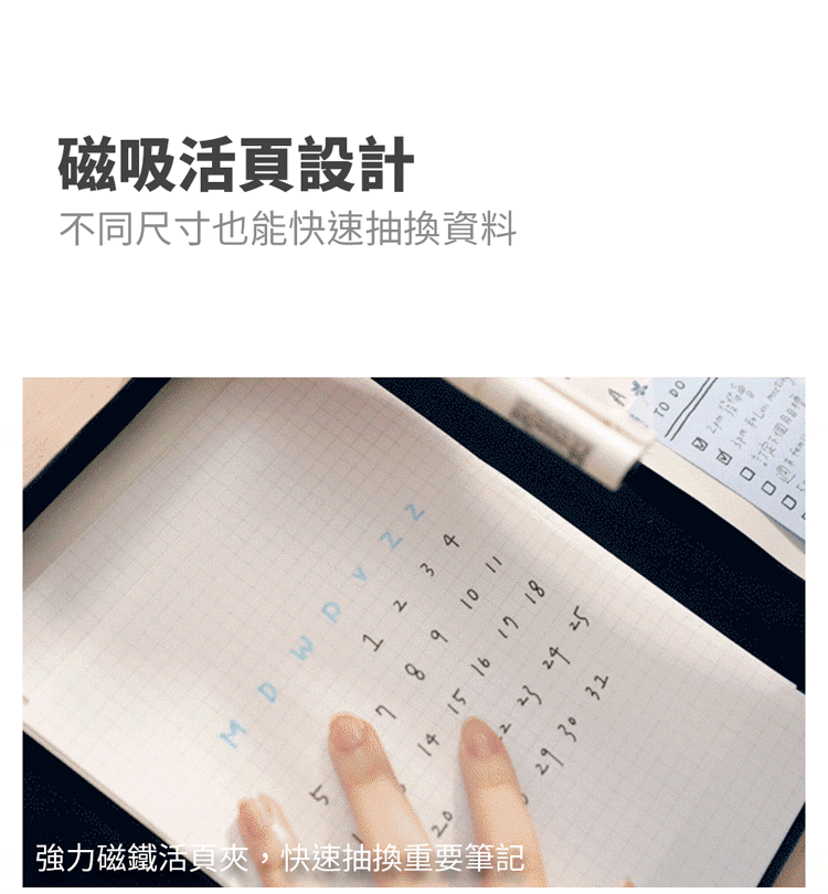 ⦿磁吸活頁設計|快速抽換資料,也不會損壞紙張